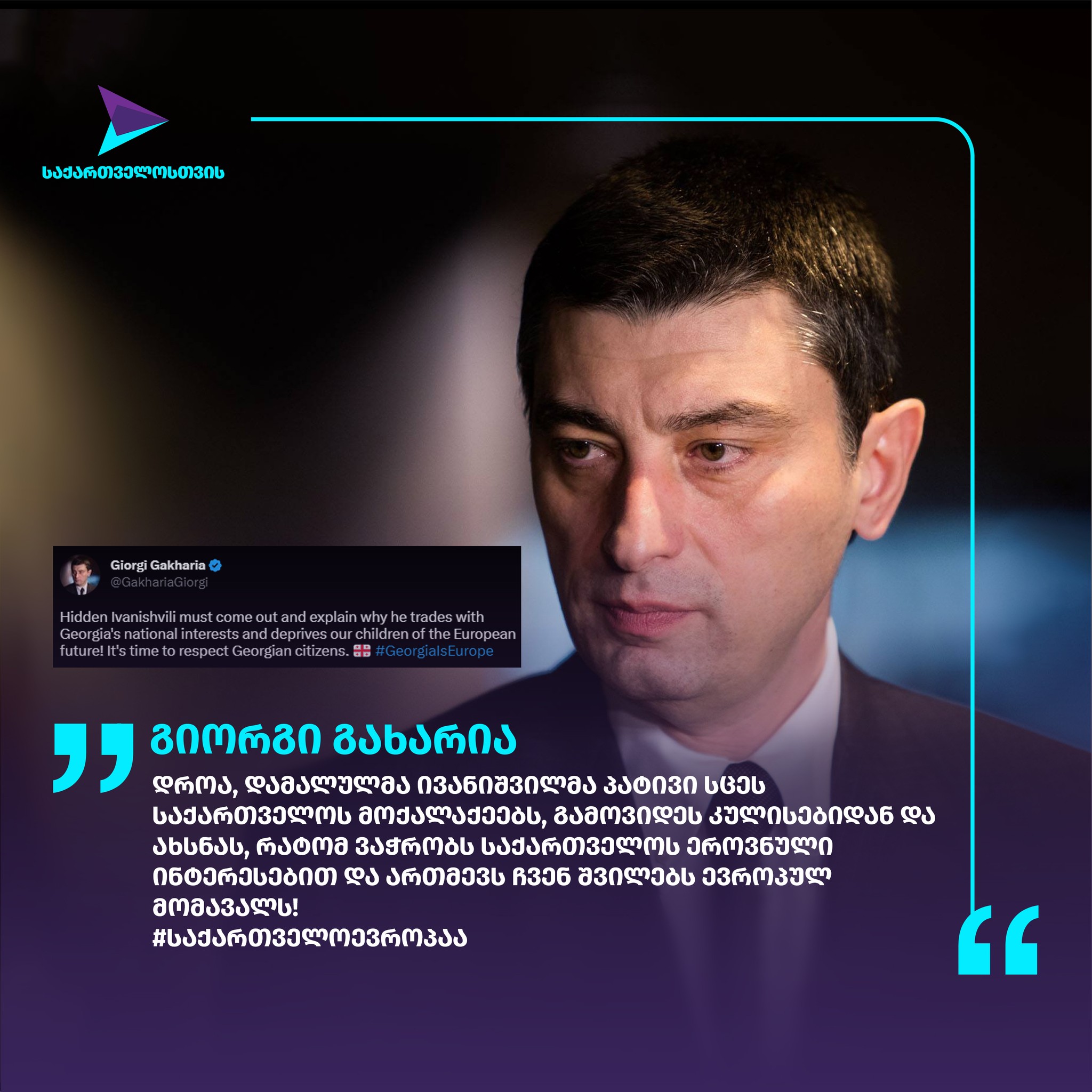 „დამალული ივანიშვილი უნდა გამოვიდეს და აუხსნას მოსახლეობას, რატომ ვაჭრობს საქართველოს ეროვნული ინტერესებით და ართმევს ჩვენს შვილებს ევროპულ მომავალს! დროა, პატივი სცეს საქართველოს მოქალაქეებს. საქართველო ევროპაა“, - წერს გახარია.