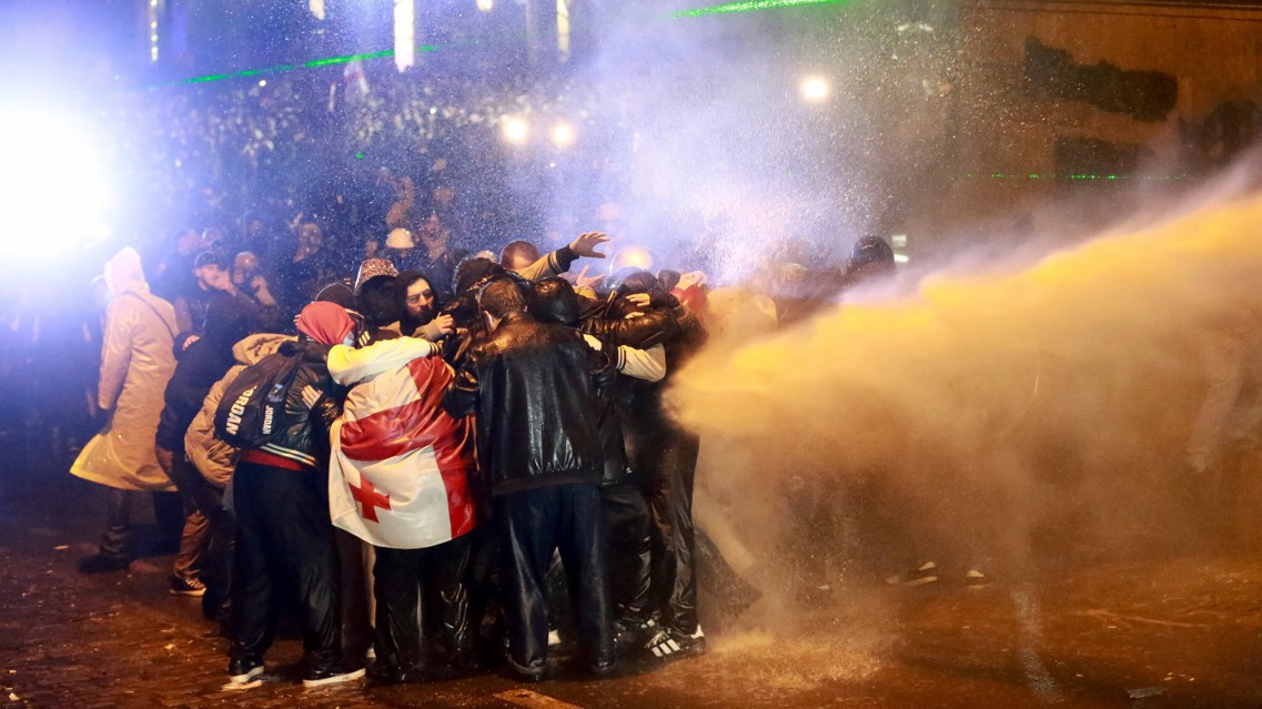 თბილისის - ქვეყნის დედაქალაქის - ცენტრში მდებარე პარლამენტის შენობასთან ათასობით დემონსტრანტი შეიკრიბა, რომლებთაგან ბევრს ტანზე ეროვნული თეთრი წითელჯვრებიანი დროშა ჰქონდათ შემოხვეული. მათ მწვანე ლაზერები პოლიციისაკენ მიმართეს და ქვეყნის ახალი მთავრობის მიმართ უთანხმოება გამოხატეს.