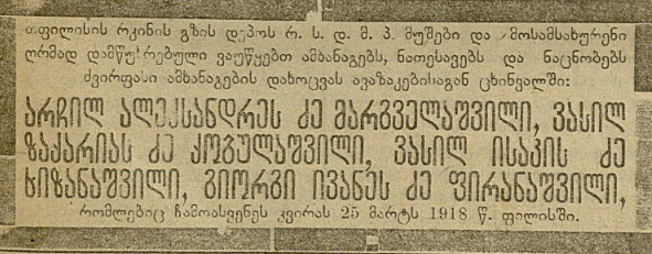ეს სტატია მაშინდელი პრესის ინფორმაციების მიხედვითაა დაწერილი. პირველი ცნობა დელეგაციის შესახებ 22 მარტს დაიბეჭდა გაზეთებში: "ერთობა" და "საქართველო". ჯავშნიანი მატარებლის უფროსი სტეფანოვი 20 მარტს გადმოსცემდა: