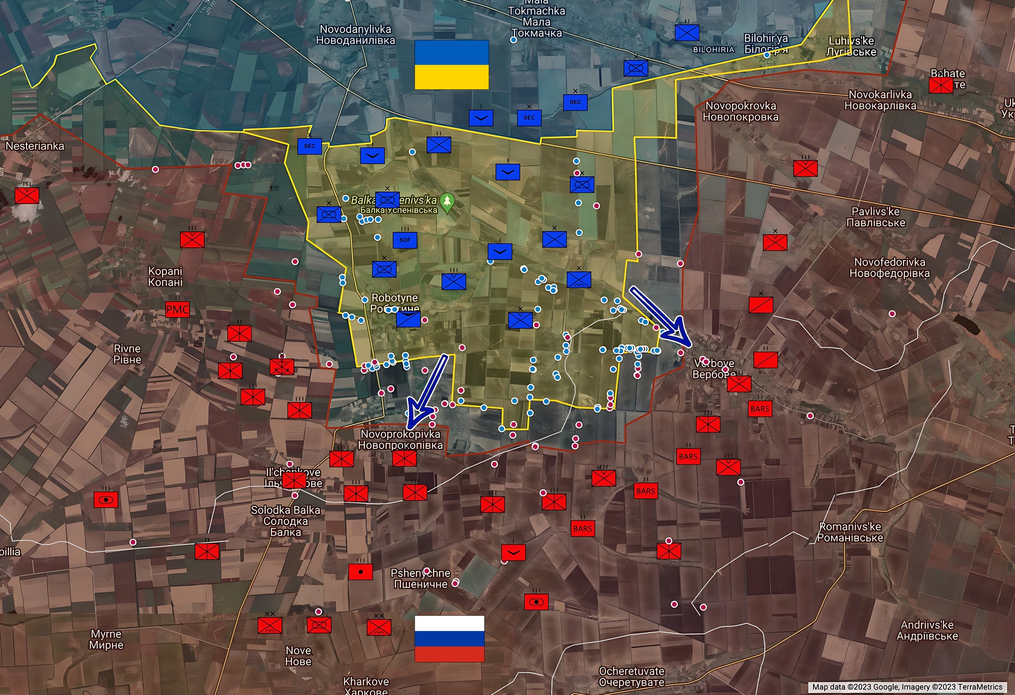 - ბახმუტის სამხრეთით, კლიშჩიივკადან უკრაინელები კიდევ უფრო აღმოსავლეთით გადავიდნენ შეტევაზე. ამჯერად შეტაკებები ოდრადივკას სიახლოვეს მიმდინარეობს. ამ მიმართულებითაც დიდი ძალებია თავმოყრილი როგორც უკრაინელთა ისე რუსების მხრიდან.