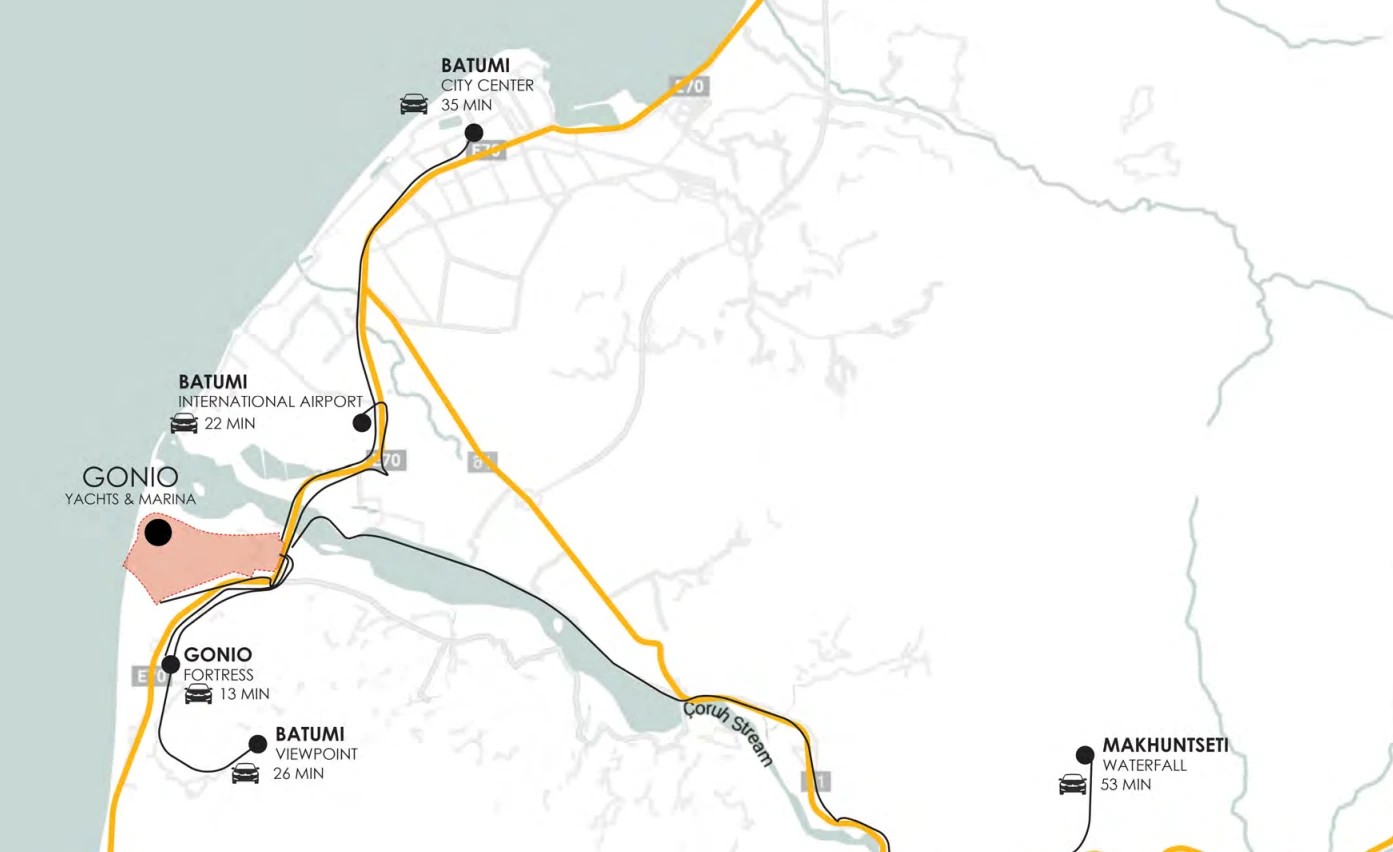 Eagle Hills-ი გონიოს ჩრდილოეთით, მდინარე ჭოროხის შესართავთან მდებარე 260 ჰექტარის მიწის ნაკვეთზე ხელოვნური ყურეს შექმნას გეგმავს. აღნიშნულ ყურეში ახალი იახტ-კლუბი მოეწყობა, მის გარშემო კი კომპანია მაღალი კლასის სასტუმროებს, მრავალბინიან საცხოვრებელ სახლებს, ვილებს, რესტორნებს, მაღალი კლასის სავაჭრო დაწესებულებებსა და სხვა ობიექტებს განათავსებს. ამის შესახებ კომპანიის მიერ გამოქვეყნებული პრეზენტაციიდან ირკვევა.