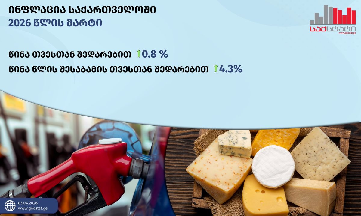 სტატისტიკის ეროვნული სამსახურის ცნობით, 2026 წლის მარტში წინა თვესთან შედარებით, ინფლაციის დონემ საქართველოში 0.8%, ხოლო წლიური ინფლაციის დონემ 4.3% შეადგინა.