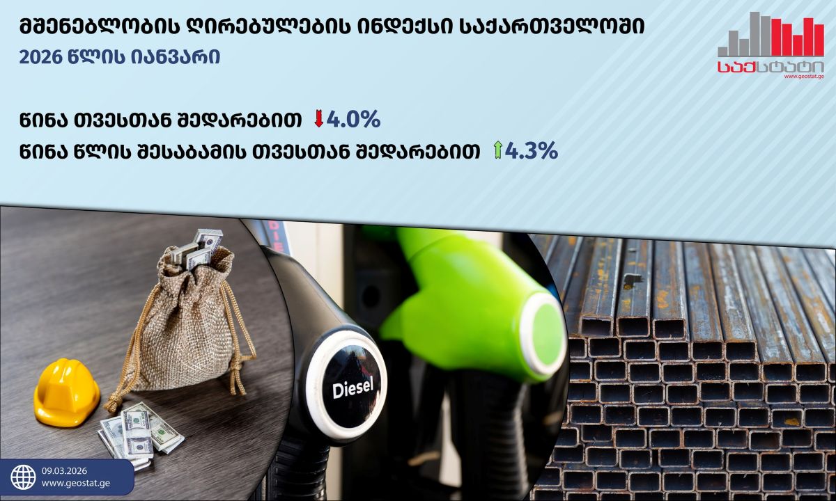 იანვარში მშენებლობა წლიურად გაძვირდა, დეკემბერთან შედარებით კი გაიაფდა. საქსტატის მიერ დღეს გამოქვეყნებული მშენებლობის ღირებულების ინდექსის იანვრის მონაცემებით, 2026 წლის იანვარში მშენებლობის ღირებულების ინდექსი წინა თვესთან შედარებით 4%-ით შემცირდა, ხოლო წინა წლის შესაბამის თვესთან შედარებით გაიზარდა 4.3%-ით. მათ შორის: