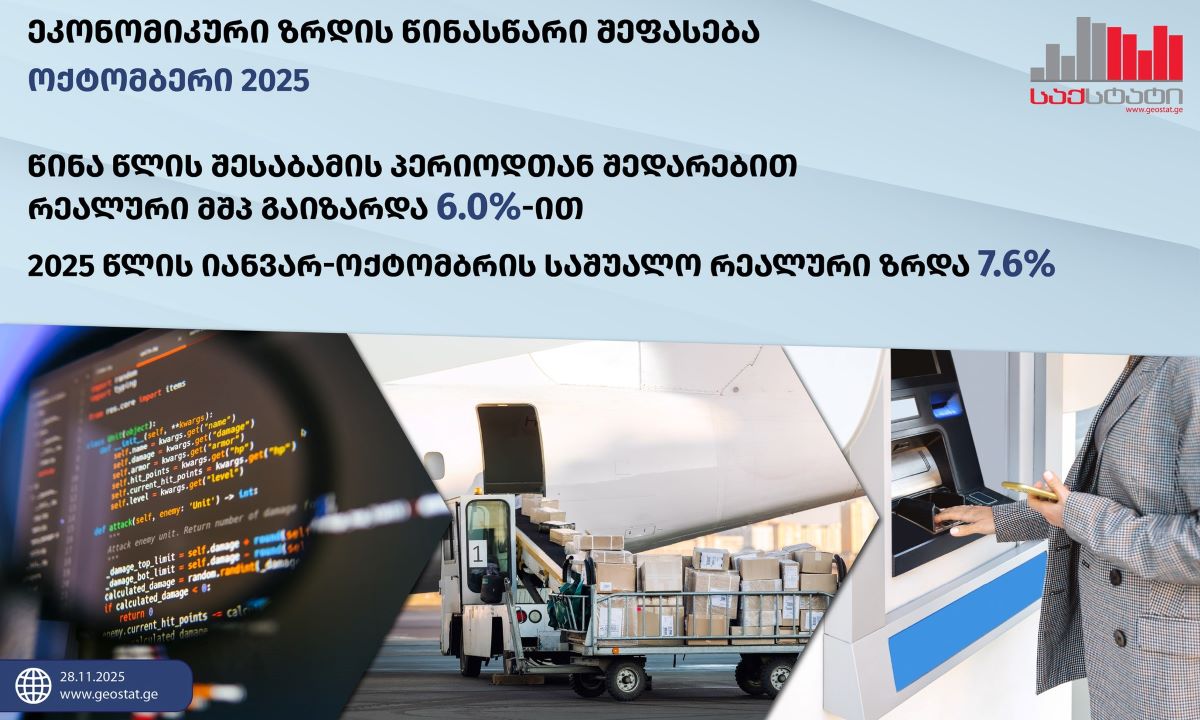 საქართველოს სტატისტიკის ეროვნული სამსახურის წინასწარი შეფასებით, 2025 წლის ოქტომბერში რეალური მთლიანი შიდა პროდუქტის ზრდამ, წინა წლის შესაბამის პერიოდთან შედარებით, 6% შეადგინა.